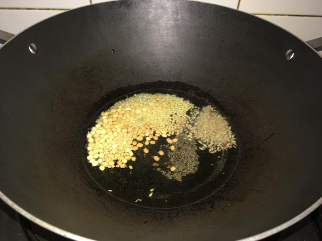 (3) Once the Mustard seeds stop spluttering, add Urad dal and allow it to change colour slightly to golden brown.